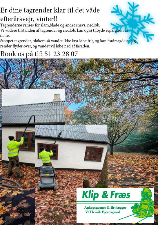 Du kan booke en tid til rensning af tagrender, nedløbsrør og sandfangsbrønde ved at udfylde vores formular. Husk at påføre dine info: Navn, adresse, tlf nr: mail.